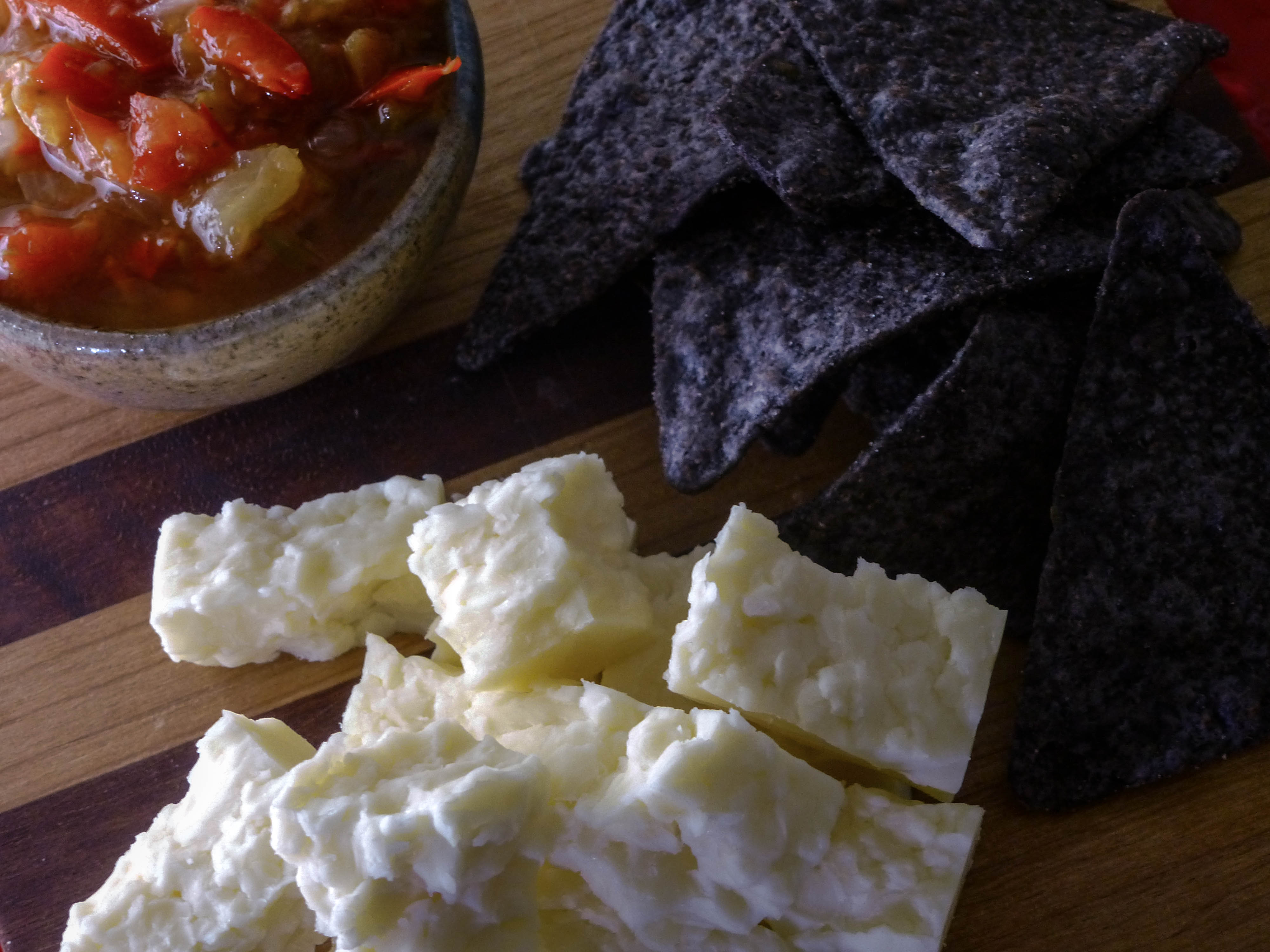 | Texture: semi-dry, crumbles into small slightly chewy curds |